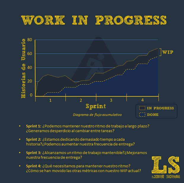 Es por eso que debemos mantener controlado y vigilado el WORK IN PROGRESS («Trabajo en progreso» en cristiano). Es decir, revisar que la diferencia entre el trabajo que estamos realizando y la cantidad de trabajo pendiente, sea más o menos similar a lo largo del tiempo.