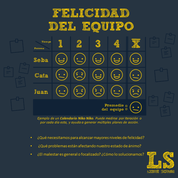 MoodApp de Attlasian o TeamMood.com son plataformas especialidades que pueden brindar apoyo para estimar esto. Un calendario Niko Niko resulta una opción más económica, sobre todo uno gestionado en Trello o Miro para tiempos de pandemia. Pero si el tiempo es escaso, siempre sirve realizar una pequeña dinámica de recolección de información en la Retro. Da igual la herramienta que escojas, lo importante es revisar los niveles de felicidad, analizarlos, entenderlos y por supuesto mejorarlos. Si te interesa profundizar un poco más en la felicidad de tu equipo, revisa este artículo!