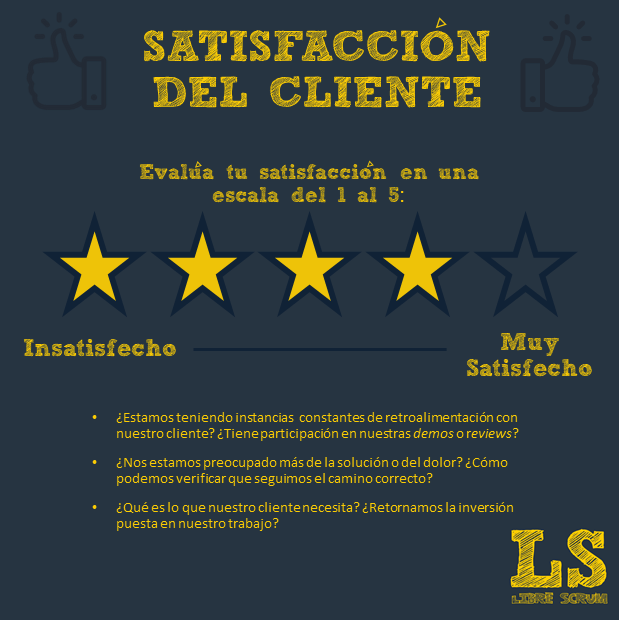 Por lo mismo, todo equipo debe conocer a su cliente, entenderlo y mantenerse en comunicación con él. Recibir su retroalimentación es la mejor guía para conseguir el éxito, por lo que facilitemos los caminos para conseguirla. Preguntémosle en una escala del 1 al 5 qué tan satisfecho está con nuestro trabajo, entreguémosle una pequeña encuesta de satisfacción al finalizar una iteración y por sobre todo invitémoslo a revisar y a opinar sobre nuestro producto de cuando en cuando (Sprint Review).