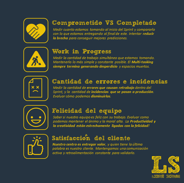 La idea acá es aportarte con métricas que puedas comenzar a implementar desde ahora mismo, y que tras analizarlas y reflexionar sobre ellas puedas encontrar más de un plan de acción para potenciar a tu equipo, esta vez diferente a «Aumentemos la carga el próximo Sprint». Así que revisémoslas: