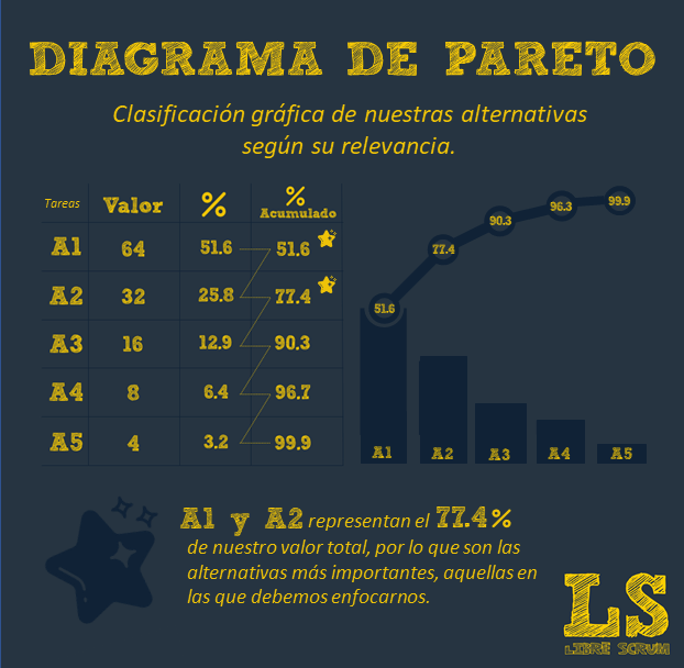 Por último, hacer el corte: Evitando el multitasking, nos centraremos en las alternativas que posean un mayor porcentaje de impacto, llegando hasta la que esté más cercana al 80% de porcentaje acumulado (90 si son muy pocas o muy sencillas, 60 si son muchas o muy complejas, cada uno conoce sus capacidades). Una vez que nos hagamos cargo de ellas, o que nuestro alcance cambie por alguna razón, volvemos a hacer este mismo análisis.