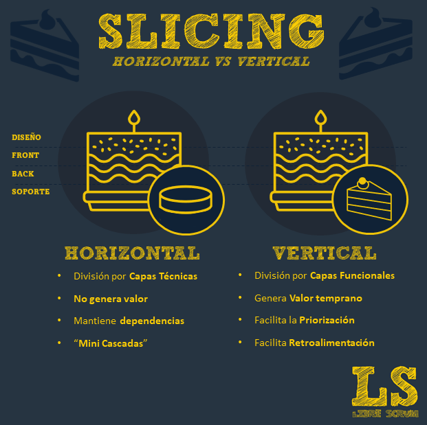 El Slicing Vertical, por otra parte, es un corte realizado por capas funcionales. No terminar todo el Front, ni el Back, pero sí integrar una parte de estos (Entregar 2 tostadas con mantequilla de las 10 prometidas). De esta manera si bien no estamos completando todas las tareas pendientes, estamos generando un valor temprano que facilita la retroalimentación, la priorización y la forma en la cual nos enfrentamos a la realidad cambiantes, y que por supuesto nos cuesta mucho menos terminar.