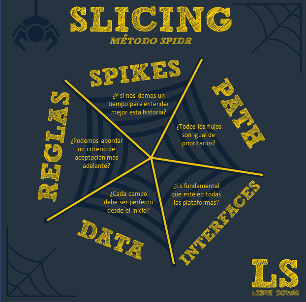 Hablaremos de SPIDR como una sugerencia de criterios que se pueden aplicar con facilidad una vez que estás trabajando con historias de usuario, y contamos con que al menos dos de estos podrán servirte para gestionar mejor tu trabajo. SPIDR es el acrónimo de SPIKE, PATH, INTERFACES, DATA y RULES.