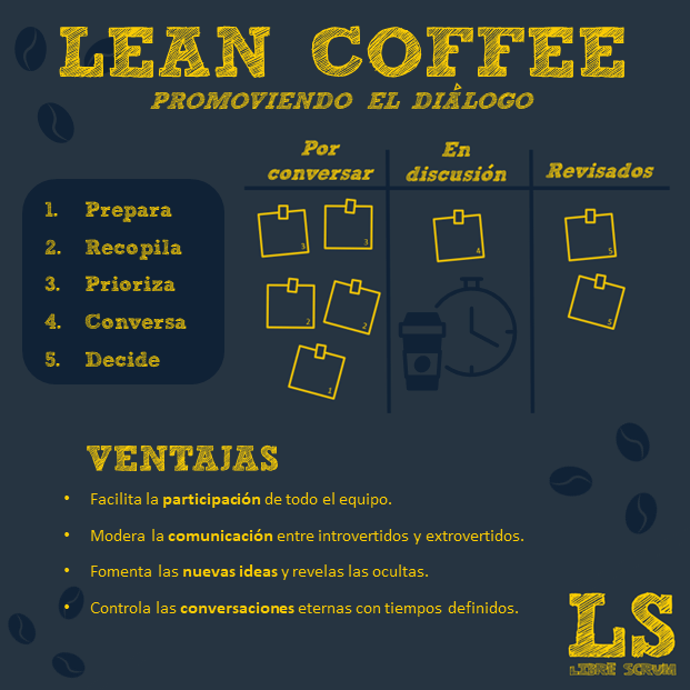 Inventada por Jeremy Lightsmith y Jim Benson, el Lean Coffee es una forma de realizar reuniones de forma práctica que además invita y permite la participación de cada integrante, puesto que esta vez el foco y la duración de este mismo es consensuada por las personas y no por una agenda prescrita ni impuesta.