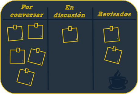 Para esto, se necesita un tablero Kanban que sirva como el radiador donde pondremos nuestro enfoque (Por conversar, en discusión, revisado), además de post-its, lápices y cronometro. ¿Y qué hacemos con este? Sencillo: