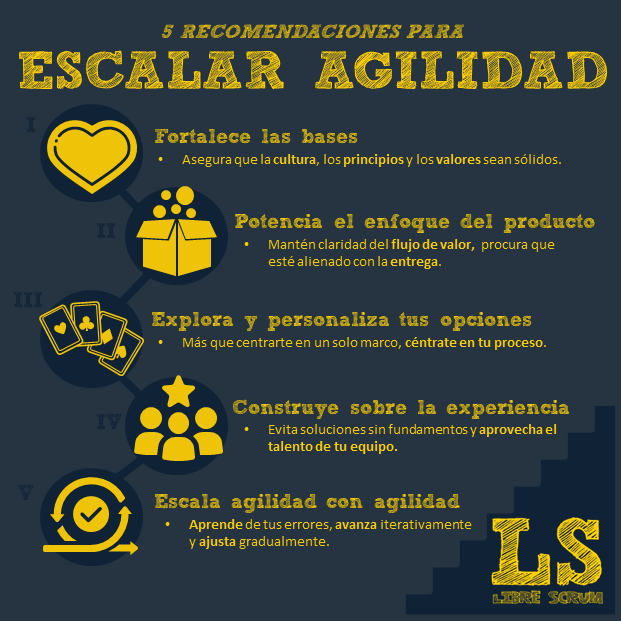 Así tal cual. Scrum no funciona si no se aplica con sus fundamentos, si no se entienden sus principios ni sus bases. Y escalar la agilidad no es diferente. No se trata de instalar un “Framework nuevo”, sino de llevar la mentalidad ya consolidada en los equipos (Con sus principios, sus valores y sus prácticas) a un mayor nivel organizacional.