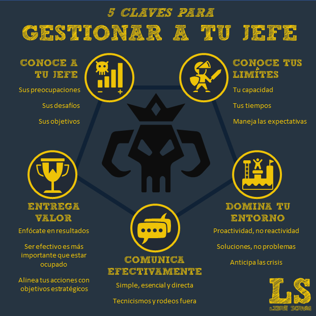 Y ojo, no se trata de decirle que sí a todo, sino de aportar valor, de ser un socio estratégico que les ayude a la toma de decisiones y a resolver los conflictos que surjan en el camino. Y sí, quizás esto esté bien alejado de las técnicas o marcos de trabajo que revisamos constantemente, pero si podemos aplicar conceptos de la agilidad, como la comunicación, el empirismo y la entrega de valor para resolverte un poco el día a día ¿Por qué no hacerlo? Por eso hoy, para ayudarte a dominar este arte tan delicado, te traemos cinco consejos para gestionar hacia arriba:
